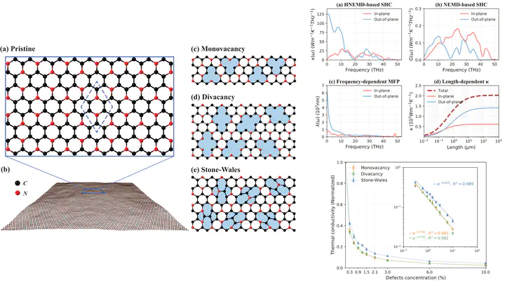 Two-dimensional polyaniline (2D-PANI) with semiconductor properties, a single crystalline carbon nitride with a stoichiometry of C3N, has attracted a lot of interest after its successful synthesis. In this study, the thermal transport properties in pristine and defective 2D-PANI were explored by extensive molecular dynamics (MD) simulations. Results based on three different versions of the MD method consistently showed that the lattice thermal conductivity of the pristine 2D-PANI is up to around 2000W m−1K−1. It decreases significantly after the introduction of structural defects and is essentially in a low-power law with the defects concentration. In addition, the difference in the weakening of thermal conductivity between vacancy and topological defects stems mainly from their respective differential effects on the low-frequency out-of-plane phonons. Remarkably, it also reveals the potential mutual constraints between anharmonic phonon-phonon scattering and phonon-defect scattering. These findings provide guidance for the thermal management of 2D-PANI-based electronic devices and are also expected to advance their application in the field of thermal design of nanomaterials.